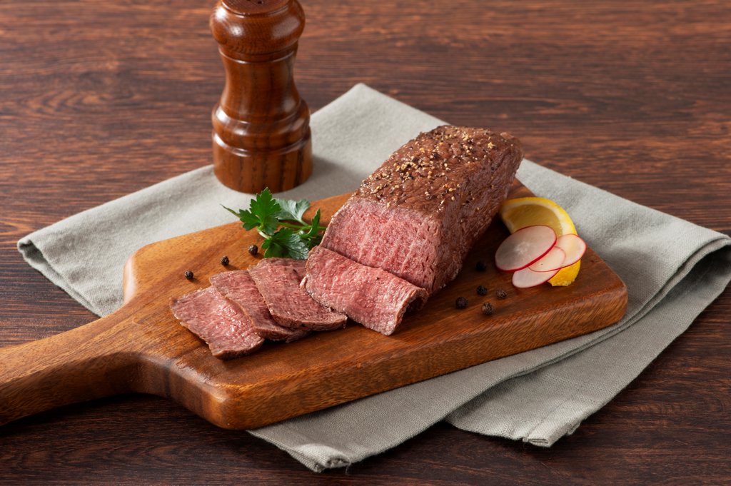 赤身と霜降りのバランスが絶妙で、黒毛和牛ならではの旨みと甘みを堪能いただけます。そんな自慢のお肉をじっくりとローストビーフに仕上げました。お肉の専門店がこだわり抜いたお肉の味わいをご堪能ください。